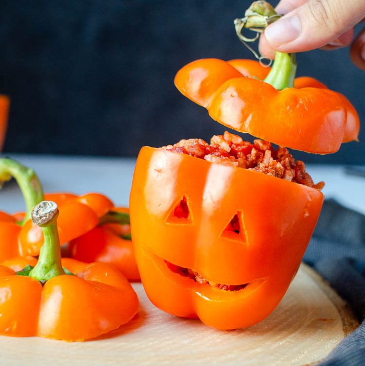 Delight in vibrant bell peppers filled with seasoned ground beef, fluffy rice, and aromatic spices for a festive Halloween treat that will captivate your guests!
