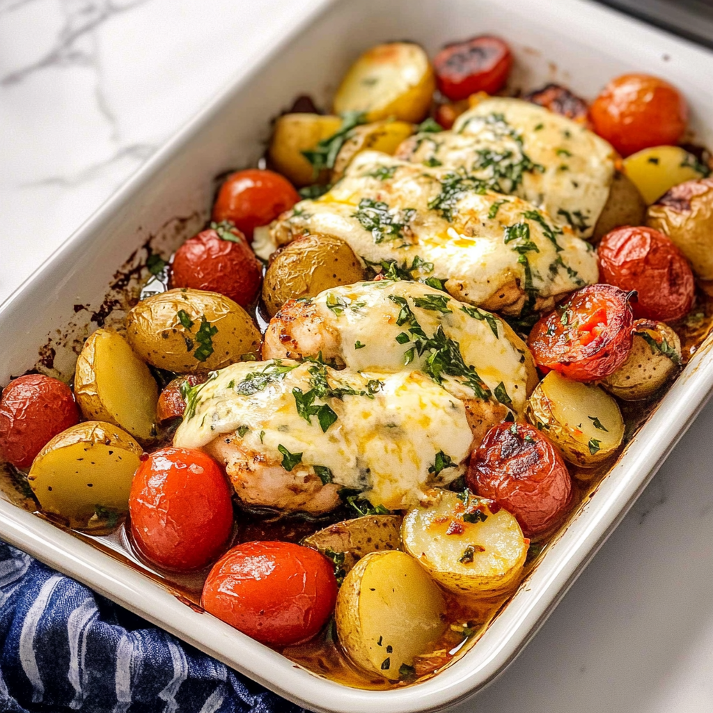 Easy Sheet Pan Mozzarella Chicken, Potatoes & Veggies