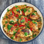 A comforting one-pan dish featuring tender chicken and fluffy rice infused with savory flavors – perfect for busy weeknights or family gatherings.