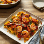 The total cooking time for Sheet Pan Shrimp & Chorizo Paella-Style Bake is approximately 30 to 40 minutes. This includes 10 minutes of prep time and about 25 to 30 minutes of baking time. The shrimp cooks quickly, so keeping an eye on it during baking ensures it remains tender and juicy. This dish is perfect for busy weeknights when you want a wholesome meal without spending hours in the kitchen.