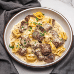 Garlic Butter Steak Bites with Creamy Parmesan Tortellini and Garlic Sauce is a delicious dish that combines juicy steak pieces cooked in garlic butter with creamy tortellini. The dish is elevated by a rich garlic sauce that ties the flavors together. It’s an easy yet impressive meal perfect for weeknight dinners or entertaining guests.