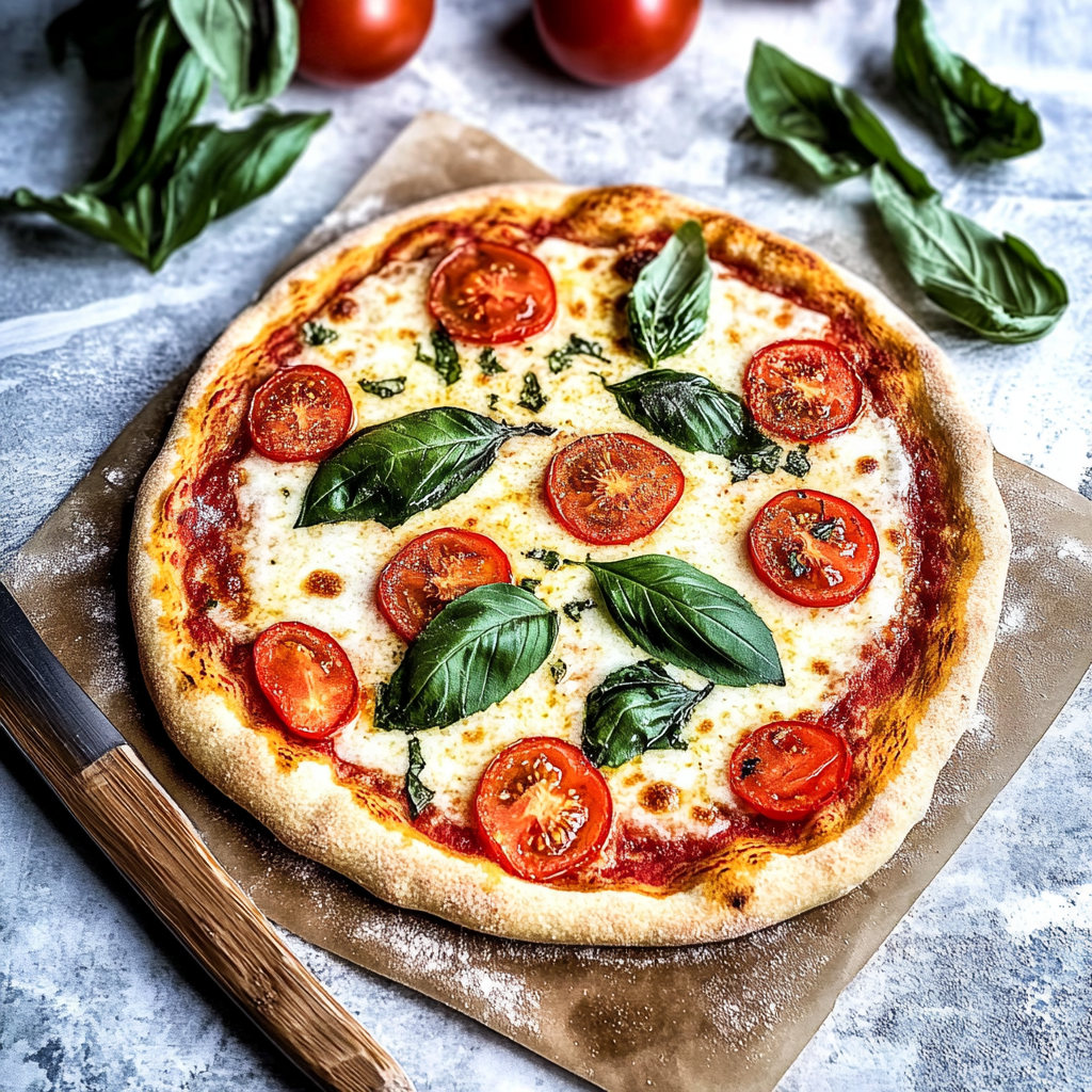Homemade margherita pizza with tomato and basil offers a delightful blend of flavors, featuring a crispy crust topped with fresh mozzarella, ripe tomatoes, and aromatic basil. Perfect for any occasion!