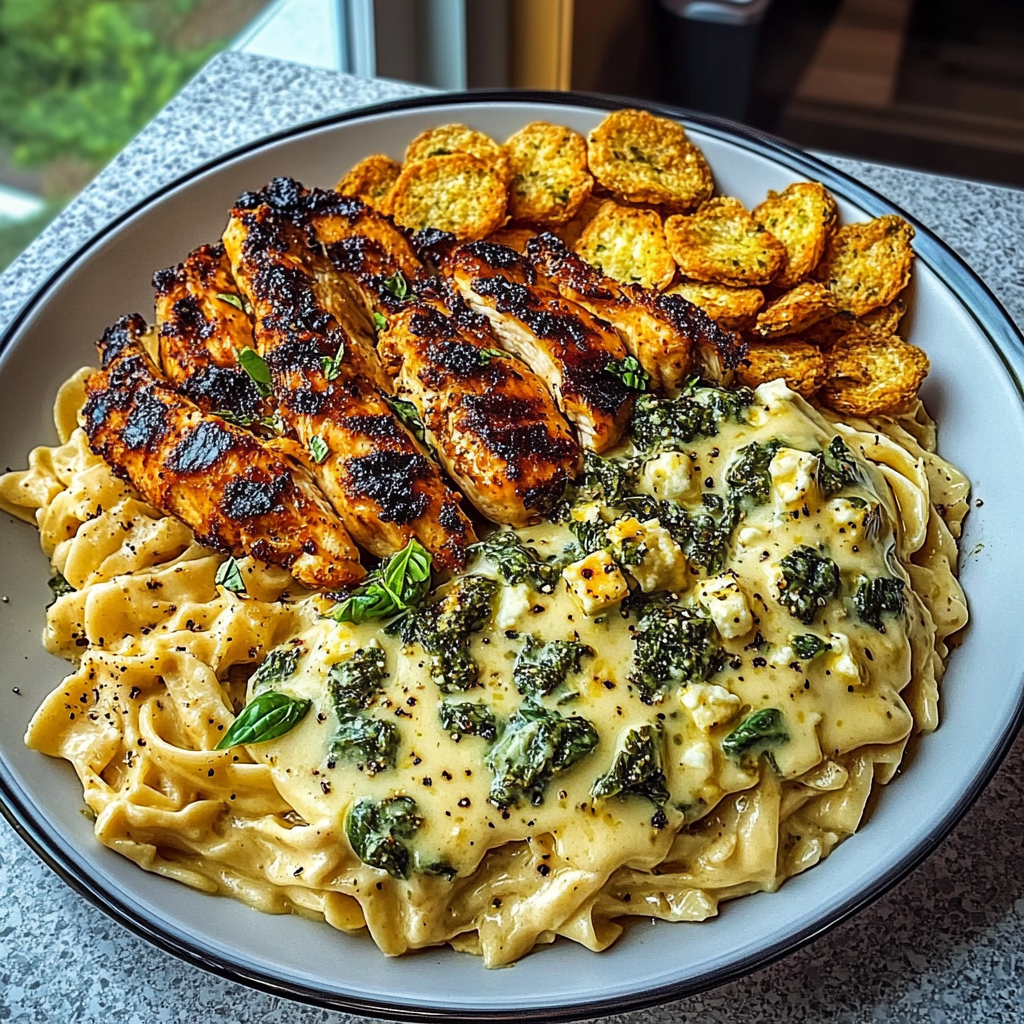 - The Hot Honey Cajun Chicken Alfredo with Basil Feta Swirl & Crispy Brussels Chips combines flavors that dance on your taste buds, making every bite feel like a celebration.