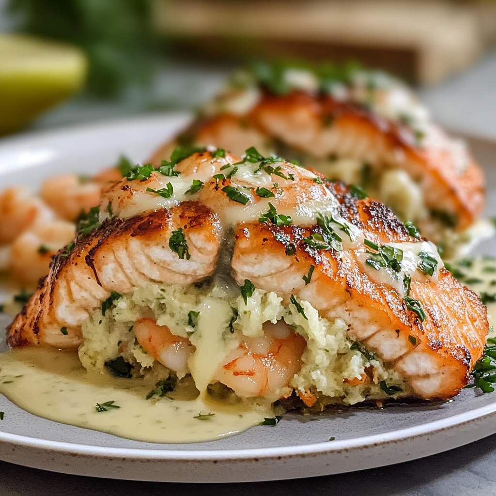 In conclusion, shrimp stuffed salmon is an exquisite dish that combines succulent salmon with a creamy and flavorful shrimp filling. Preparing this dish is simple yet rewarding, making it ideal for any occasion. By following easy steps to prepare both the salmon and stuffing, you can impress your guests or family members alike. Serve it alongside fresh vegetables or rice for a complete meal that highlights the best of seafood cooking. Enjoy this delightful recipe that promises to be a crowd-pleaser every time!